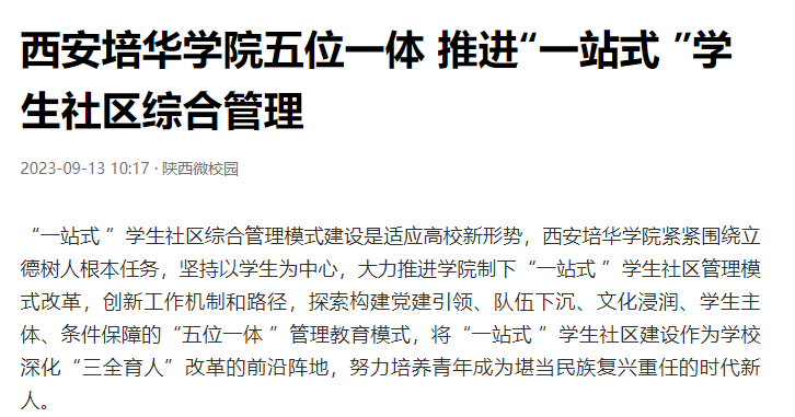 “一站式 ”学生社区综合管理模式建设是适应高校新形势,西安培华学院紧紧围绕立德树人根本任务,坚持以学生为中心,大力推进学院制下“一站式 ”学生社区管理模式改革,创新工作机制和路径,探索构建党建引领、队伍下沉、文化浸润、学生主体、条件保障的“五位一体 ”管理教育模式,将“一站式 ”学生社区建设作为学校深化“三全育人”改革的前沿阵地,努力培养青年成为堪当民族复兴重任的时代新人。