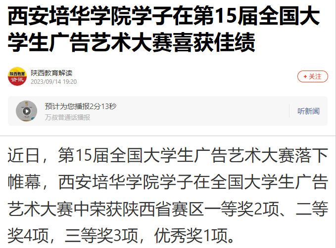 近日,第15届全国大学生广告艺术大赛落下帷幕,培华学子在全国大学生广告艺术大赛中荣获陕西省赛区一等奖2项、二等奖4项,三等奖3项,优秀奖1项。