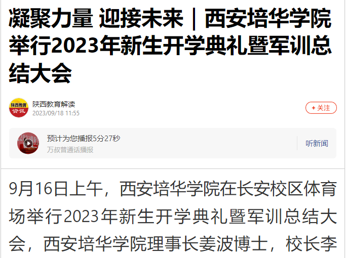 9月16日上午,西安培华学院在长安校区体育场举行2023年新生开学典礼暨军训总结大会,西安培华学院理事长姜波博士,校长李映方教授,学术委员会主席、副校长、人文与国际教育学院院长刘越莲教授,党委副书记、副校长姚文静副教授,副校长、医学院院长于国亮教授,党委副书记、纪委书记徐国富教授,财务总监薛清同志,校长助理张运良教授,校长助理姜涛同志,校长助理秦海锋副教授出席了大会,各二级学院、职能部门负责人,教师代表,学生家长代表及全体2023级新生参加了大会。