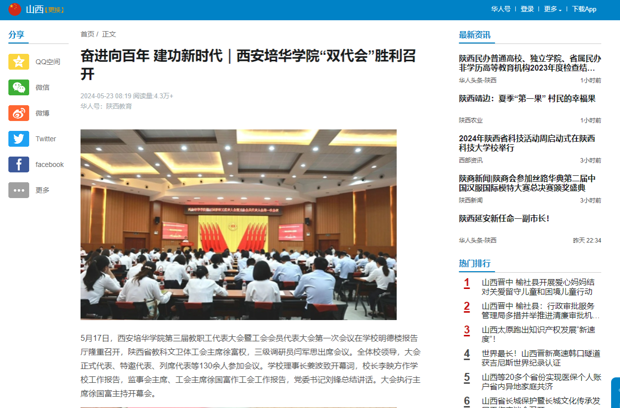 5月17日,西安培华学院第三届教职工代表大会暨工会会员代表大会第一次会议在学校明德楼报告厅隆重召开,陕西省教科文卫体工会主席徐富权,三级调研员闫军思出席会议。全体校领导,大会正式代表、特邀代表、列席代表等130余人参加会议。学校理事长姜波致开幕词,校长李映方作学校工作报告,监事会主席、工会主席徐国富作工会工作报告,党委书记刘锋总结讲话。大会执行主席徐国富主持开幕会。
