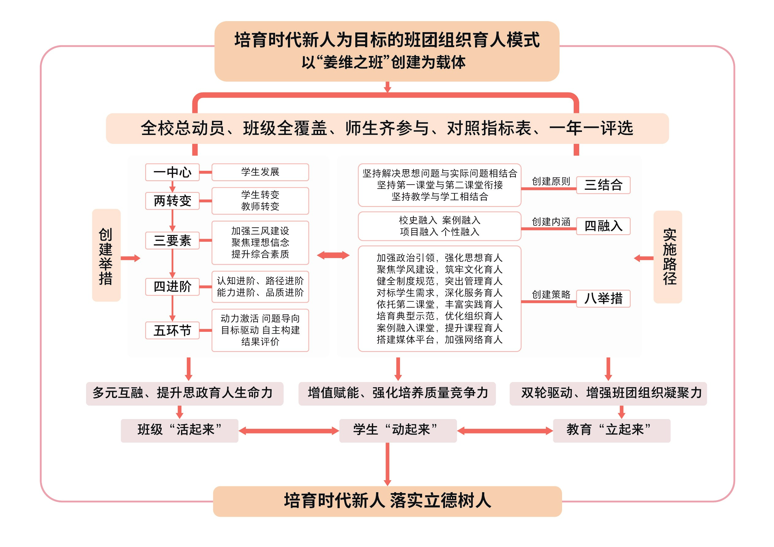 姜维之班”整合育人力量、贯通育人过程,实现了进阶+闭环的机制创新。 通过“12345”创建机制,即树立一个中心:学生全面发展;实现两个转变:一是学生转变(被动安排到自我驱动),二是教师转变(指导学生挖掘潜能);聚焦三大要素:一是创建过程聚焦红色教育,加强理想信念教育;二是持续聚焦专业学习,着力加强三风建设;三是持续聚焦全面发展,促进增值赋能提升;推进四个进阶:认知进阶(培育时代新人价值)、路径进阶(八大举措)、能力进阶(实现应用知识能力、实践能力和解决问题能力跃升)、品质进阶(把控创建环节和质量);激活五大环节:动力激活(激活班级和学生的活力)、问题导向(班情学情分析,发现问题)、目标驱动(根据实际确定班级发展目标)、自主构建(因材施教,一班一策)、结果评价(每年考核、表彰,确保质量)。