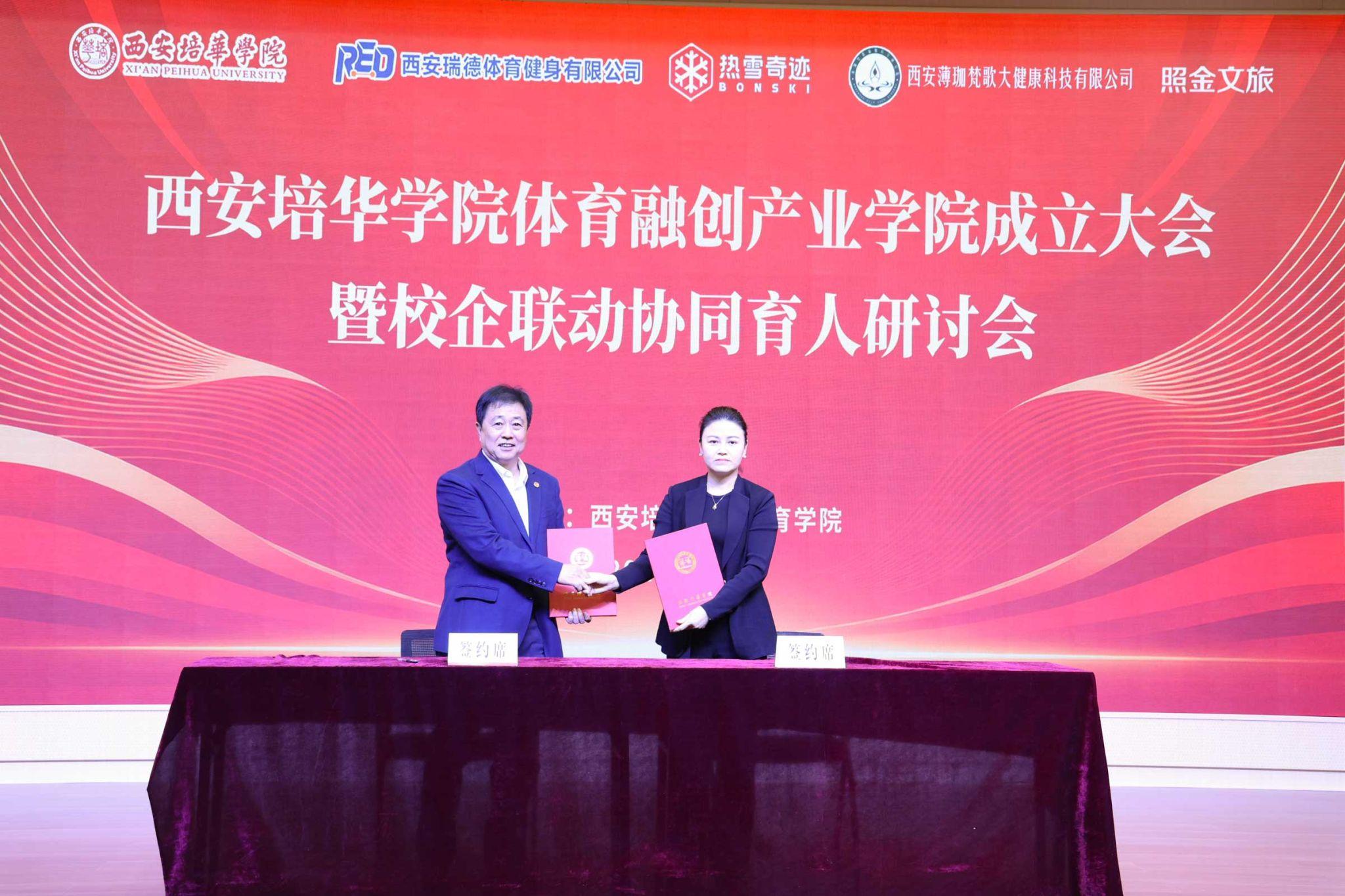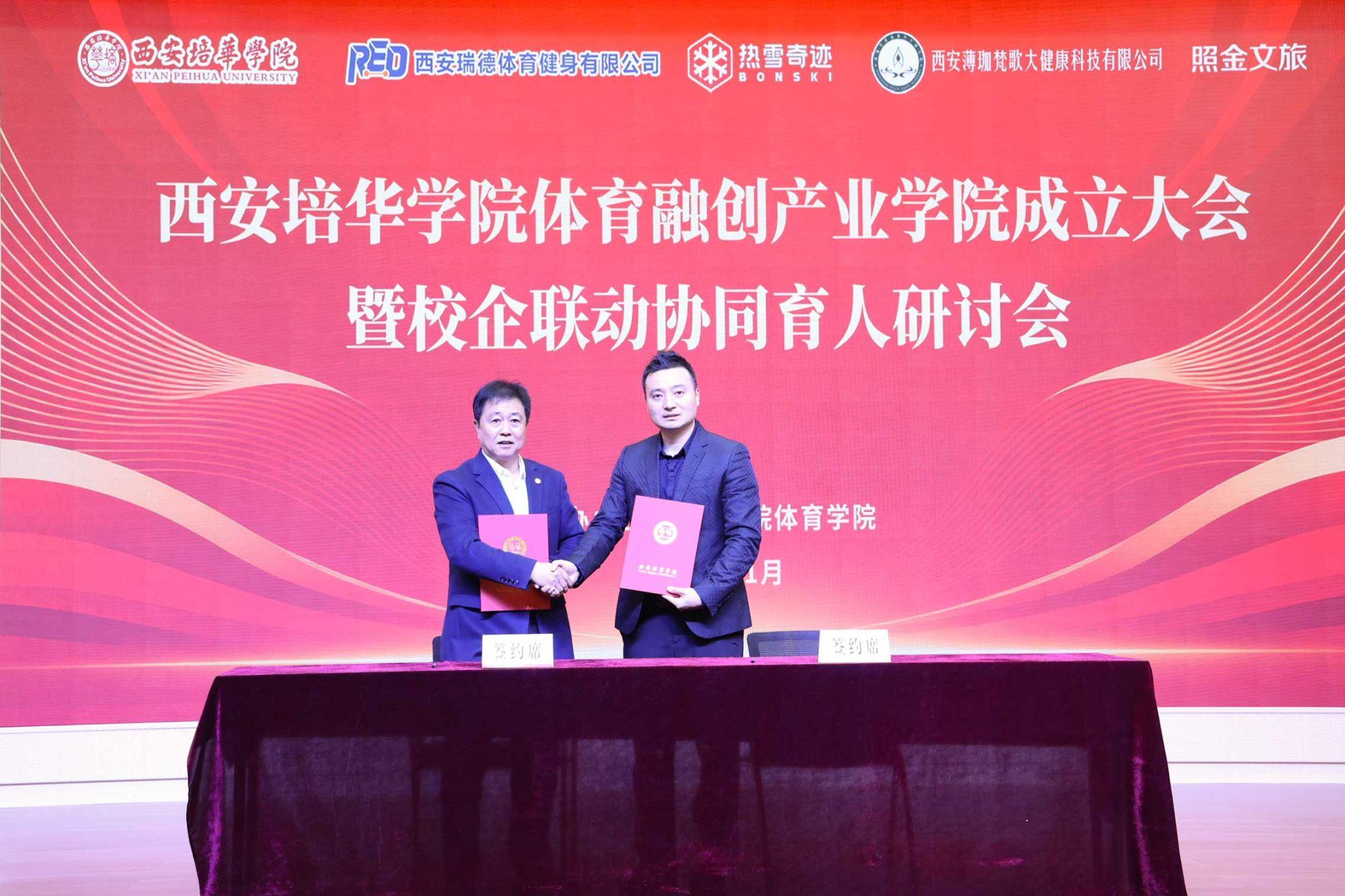成立大会上,体育学院院长、体育融创产业学院管理委员会主任王志强与西安瑞德体育健身有限公司、西安雪迹体育发展有限公司、西安薄珈梵歌大健康科技有限公司、陕西照金文化旅游投资开发有限公司四家企业负责人现场签订校企合作协议,标志着各方将在人才培养、实践教学、科研转化等领域开展深度合作。