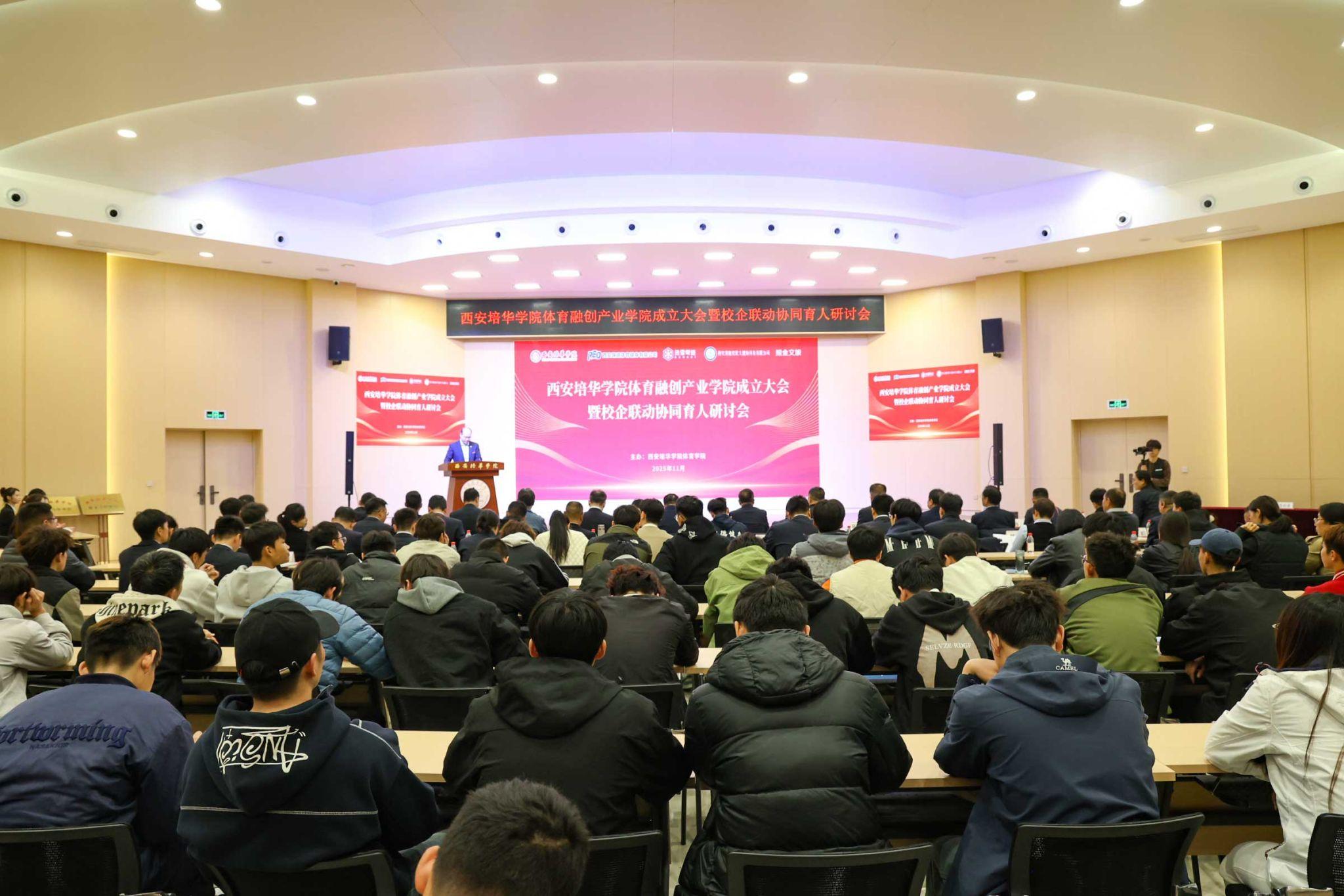 11月5日,西安培华学院体育融创产业学院成立大会暨校企联动协同育人研讨会在学校明德楼四楼报告厅举行。来自政府部门、行业协会、合作企业及高校的百余位嘉宾齐聚一堂,就体育领域校企协同育人与产业高质量发展进行了深入探讨。本次大会由体育学院行政副院长马德厚主持。