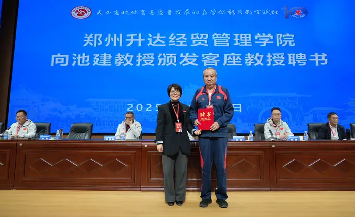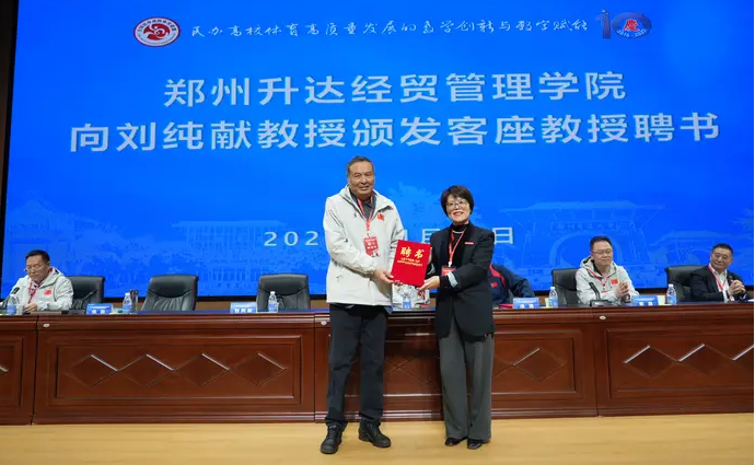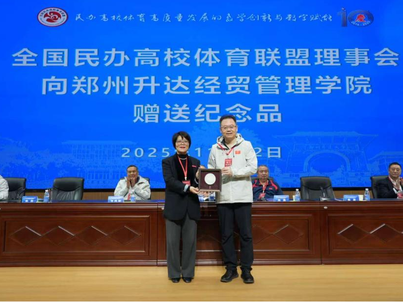 仪式现场,郑州升达经贸管理学院校长张欣与全国民办高校体育联盟理事长姜波博士互赠纪念品。这份互赠不仅承载着升达学院对联盟的诚挚谢意,更凝聚了双方深化合作、共促民办高校体育教育发展的美好愿景。