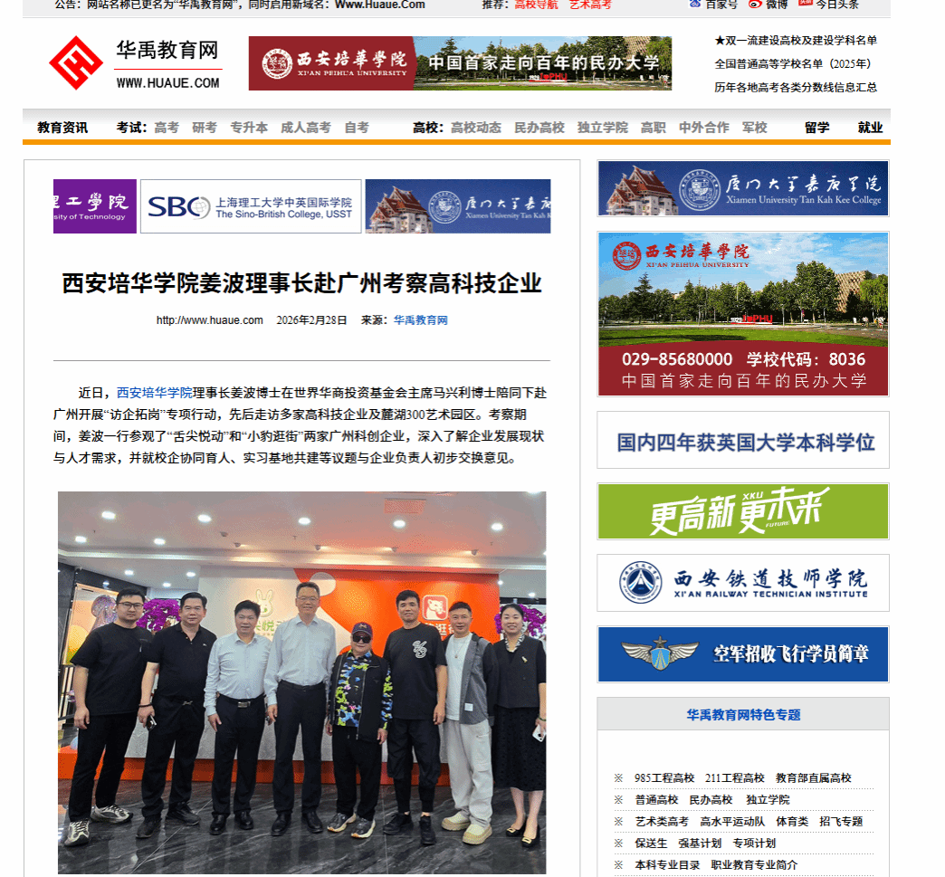 近日,西安培华学院理事长姜波博士在世界华商投资基金会主席马兴利博士陪同下赴广州开展“访企拓岗”专项行动,先后走访多家高科技企业及麓湖300艺术园区。考察期间,姜波一行参观了“舌尖悦动”和“小豹逛街”两家广州科创企业,深入了解企业发展现状与人才需求,并就校企协同育人、实习基地共建等议题与企业负责人初步交换意见。