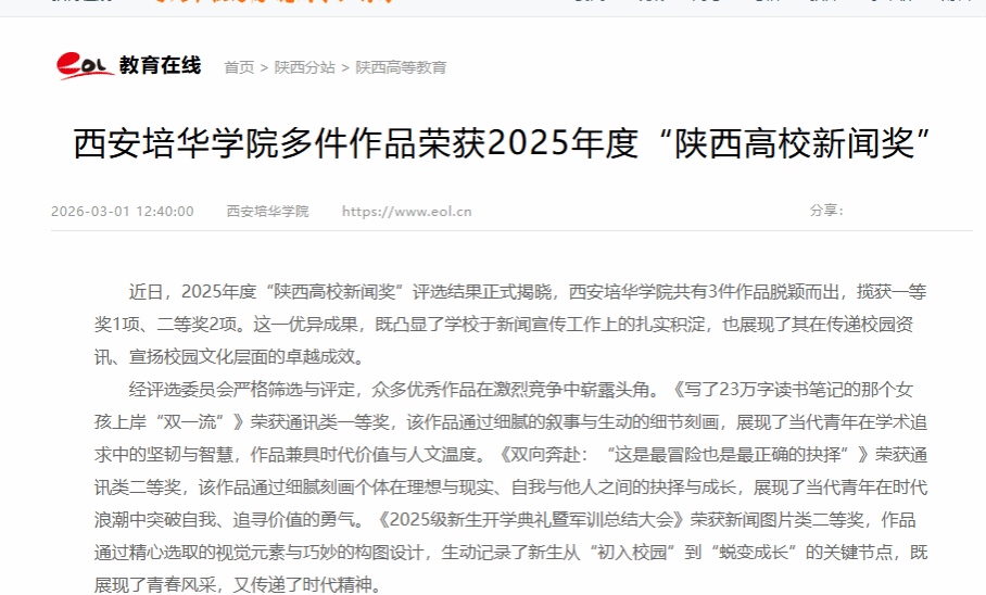 中国教育在线:西安培华学院多件作品荣获2025年度“陕西高校新闻奖”