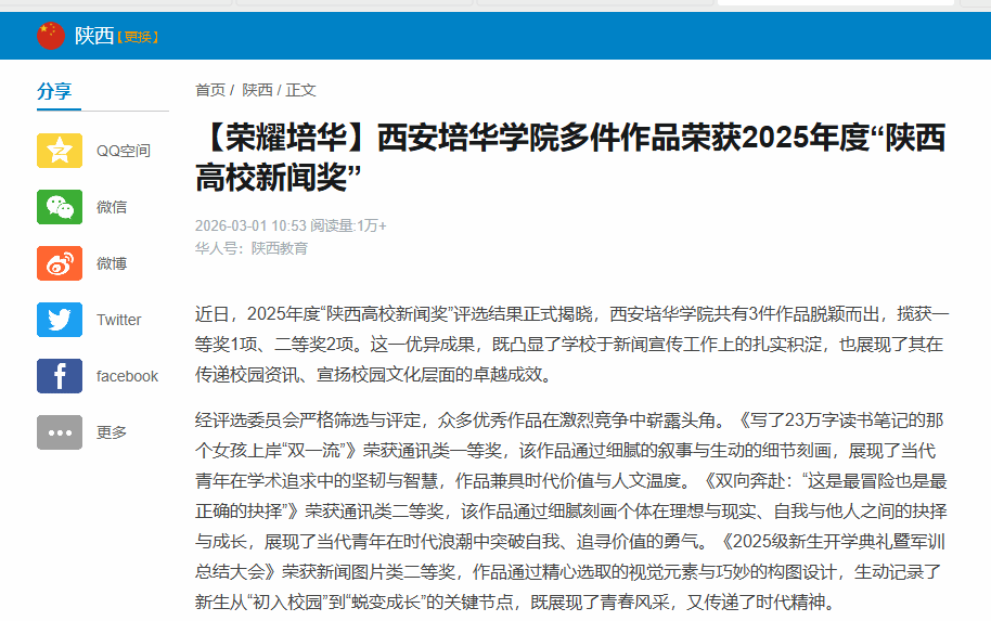 近日,2025年度“陕西高校新闻奖”评选结果正式揭晓,西安培华学院共有3件作品脱颖而出,揽获一等奖1项、二等奖2项。这一优异成果,既凸显了学校于新闻宣传工作上的扎实积淀,也展现了其在传递校园资讯、宣扬校园文化层面的卓越成效。