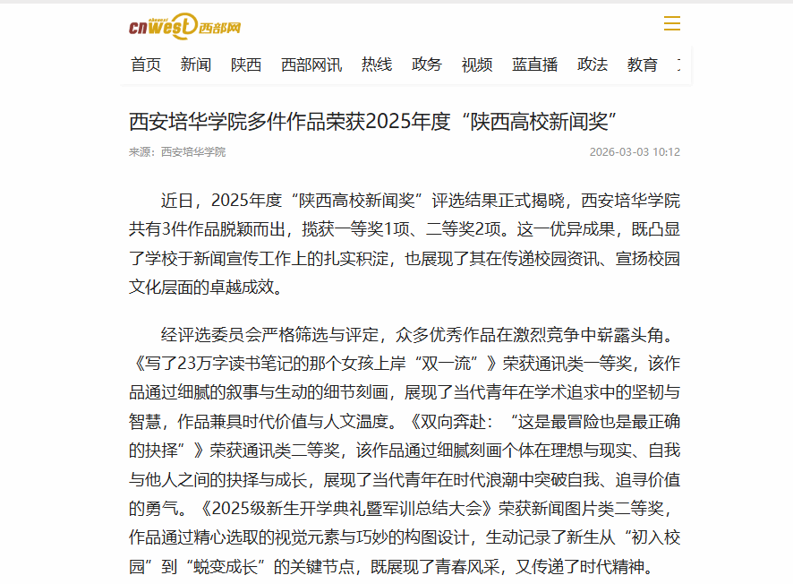 近日,2025年度“陕西高校新闻奖”评选结果正式揭晓,西安培华学院共有3件作品脱颖而出,揽获一等奖1项、二等奖2项。这一优异成果,既凸显了学校于新闻宣传工作上的扎实积淀,也展现了其在传递校园资讯、宣扬校园文化层面的卓越成效。