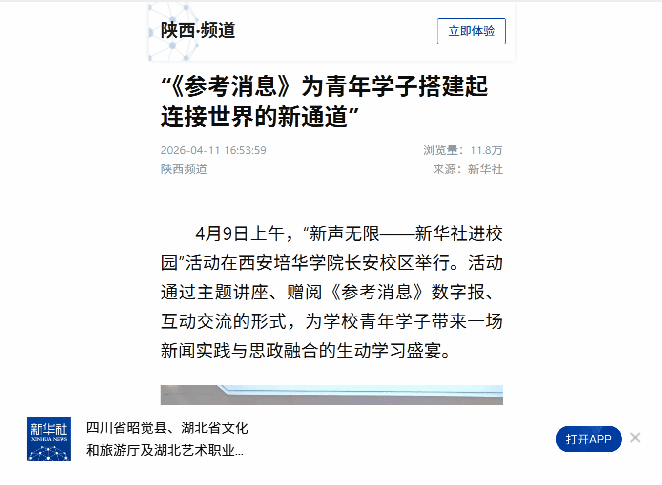 4月9日上午,“新声无限——新华社进校园”活动在西安培华学院长安校区举行。活动通过主题讲座、赠阅《参考消息》数字报、互动交流的形式,为学校青年学子带来一场新闻实践与思政融合的生动学习盛宴。