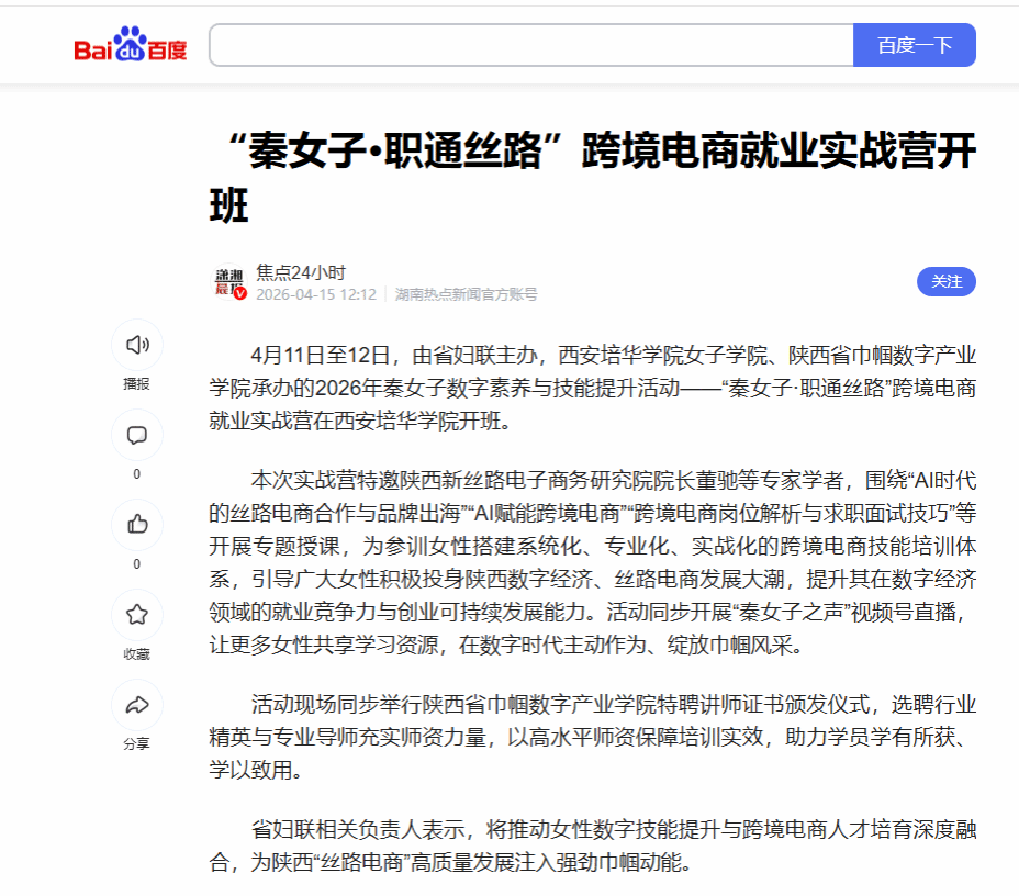 4月11日至12日,由省妇联主办,西安培华学院女子学院、陕西省巾帼数字产业学院承办的2026年秦女子数字素养与技能提升活动——“秦女子·职通丝路”跨境电商就业实战营在西安培华学院开班。