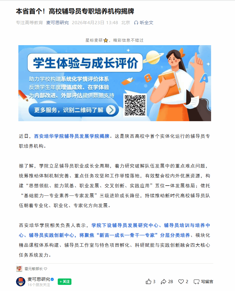 麦可思:本省首个!高校辅导员专职培养机构揭牌