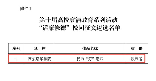近日,教育部办公厅公布了第十届高校廉洁教育系列活动结果,西安培华学院推送作品成功入选全国高校“话廉修德”校园征文优秀作品。此次获奖充分彰显了学校新时代廉洁文化向纵深推进,向师生延伸、向全校覆盖的扎实成效。