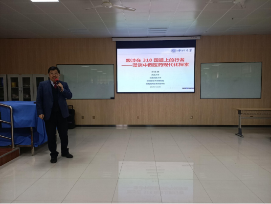 为提升药学系教师科研能力、促进专业学科更好发展,加快药学一流专业建设及申硕发展进程,拓宽药学系师生对药学专业、创新药物新发展的视野,医学院药学系特邀西北大学生命科学与医学部药学院郑晓晖教授(高等学校专业设置与教学指导委员会药学类工作委员会,委员)于12月8日下午在医学院至善楼8227教室,进行“跋涉在318国道上的行者---漫谈中医药现代化探索”的学术报告会,西安培华学院副校长兼医学院院长于国亮教授,医学院常务副院长扈国栋教授,医学院行政副院长王平安,药学系主任李元教授,学科带头人刘建利教授,以及药学系近150名师生参加了此次讲座。讲座由药学系副主任方欢乐主持。