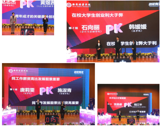在总决赛现场,8名选手分成粉紫双方,通过VCR视频展示、自我介绍、辩论赛等形式充分展示自我,现场的评委老师就参赛选手学科专业不同,分别给出专业点评与指导意见,并达成用人单位实习意向,现场颁发实习offer。