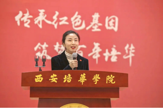 西安培华学院理事长姜波在致辞时表示,西安培华学院自建校之初就具有红色基因,始终将爱国主义精神融入到教育办学的工作当中。希望通过此次活动用红色主题教育活动去影响当代大学生,教育学生认真地学党史、学国史;希望社会主义伟大建设事业薪火相传;希望培华人不忘初心、勇担使命、携手并进,做一名合格的社会主义接班人。