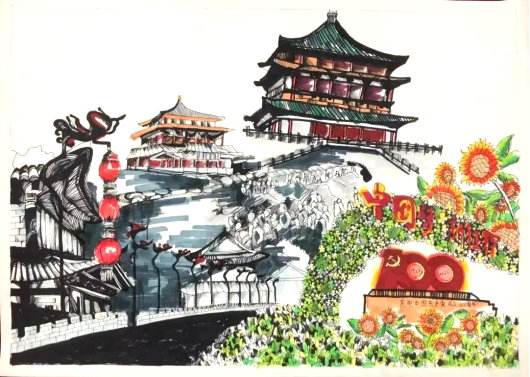 环境设计专业郭晓柯:我的家乡是西安,这个作品将家乡美与建党一百年的主题融合,所绘的是西安的钟鼓楼,融入建党百年元素,展示了西安人民为党庆生的热情。