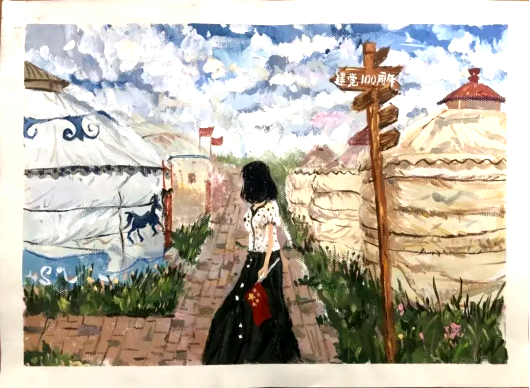 视觉传达专业陈萌:我的家乡是内蒙古自治区,在内蒙古的大草原上,有成群结队的羊群和马队以及一个连一个的蒙古包。蒙古包外,飘扬的五星红旗以及建党百年的指示路标,预示着蒙古人民也沉浸在建党百年的喜悦中。