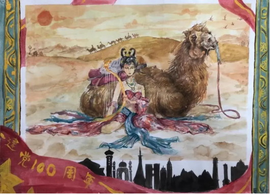 视觉传达专业朱绘雪:我来自美丽的新疆。画中有神秘的边野荒漠,一条丝绸之路贯穿古今,成了最美的风景线,在驼铃声中,胡女手中演奏的音乐诉说着党和人民的故事。从茫茫边荒变成如今的繁华城市,飘扬的国旗彰显着党对少数民族的呵护与关怀。
