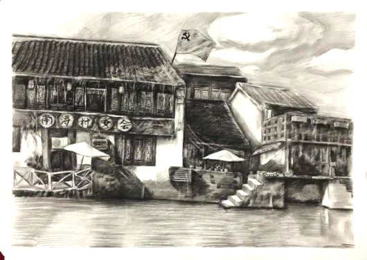 视觉传达专业朱浩阳:我的家乡在浙江省湖州市,那里有迷人的风光、潺潺的流水及闻名遐迩的水乡房屋。我画的作品是湖州市南浔区的一处景象,流水、党旗等元素,在时空上呼应了中国共产党在1921年的浙江嘉兴南湖诞生,随着时间发展,见证了建党的一百周年。