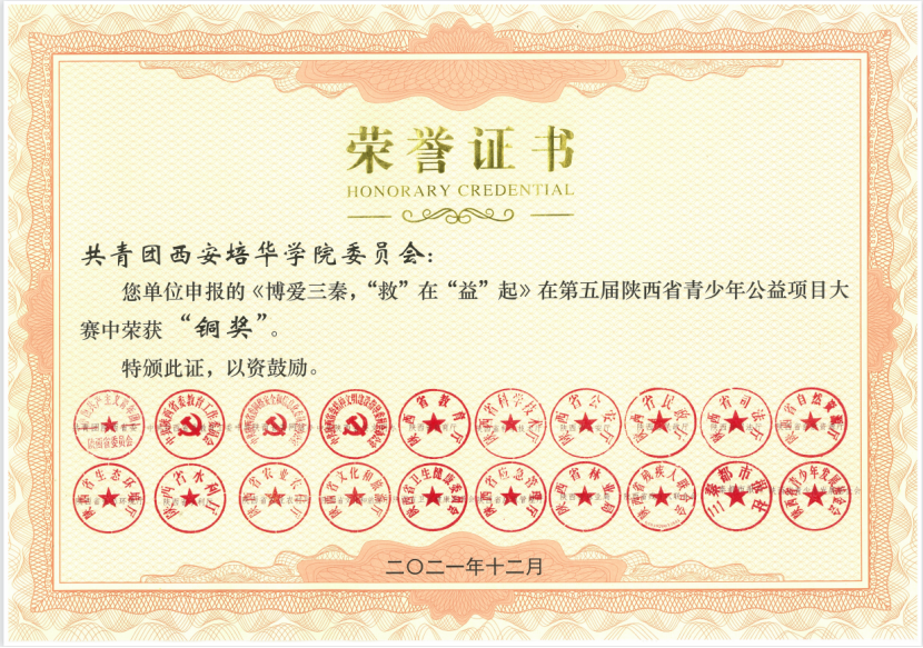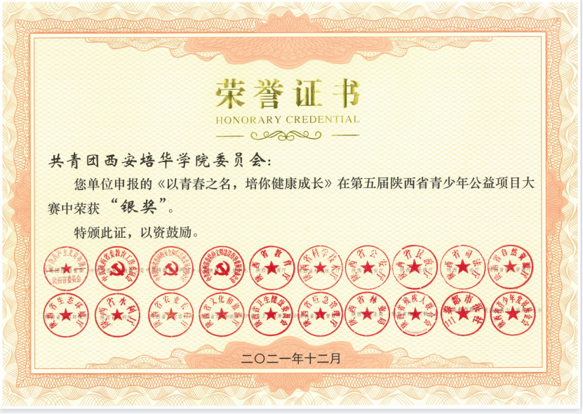 近日,第五届陕西省青少年公益项目大赛比赛结果揭晓。根据陕团联发《共青团陕西省委陕西省委教育工委 陕西省委网信办等关于第五届陕西省青少年公益项目大赛获奖情况的通报》,由学校推荐的《材优乡创——扎实培育学子,稳推“吴堡就业”》《以青春之名,陪你健康成长》荣获银奖,《博爱三秦,“救”在“益”起》《与你同行,守护未来》荣获铜奖,学校团委荣获本届大赛优秀组织奖。