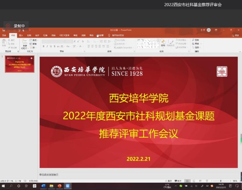 依据《2022年西安市社会科学规划基金课题指南公告》中有关申报材料要求的规定,学校科研管理中心对该课题立项申请材料逐项进行形式审查,将审查合格材料进行汇总,于2月21日召开推荐评审工作会议。科研管理中心主任王西安、副主任莫姣姣、校学术委员会部分委员出席。会议由校长助理张运良主持。