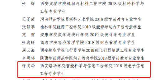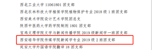 近日,为表彰先进,激励广大团员、团干部和基层团组织奋发有为、再创佳绩,共青团陕西省委发布了《关于表彰2020-2021年度“陕西省优秀共青团员”“陕西省优秀共青团干部”及“陕西省五四红旗团支部”“陕西省五四红旗团委”的决定》,其中,我校传媒学院新闻学专业2019级2班团支部被评为2020-2021年度“陕西省五四红旗团支部”,我校智能科学与信息工程学院2018级电子信息工程专业学生许向泽被评为2020-2021年度“陕西省优秀共青团员”。