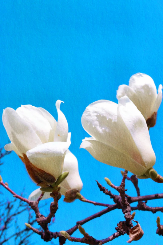 美丽的玉兰在绿叶尽无的枝干上摇曳,娇艳欲滴,煞是好看,如同静蓝天空白云悠然,含笑淡然,瞬间绽放久违的好心情。