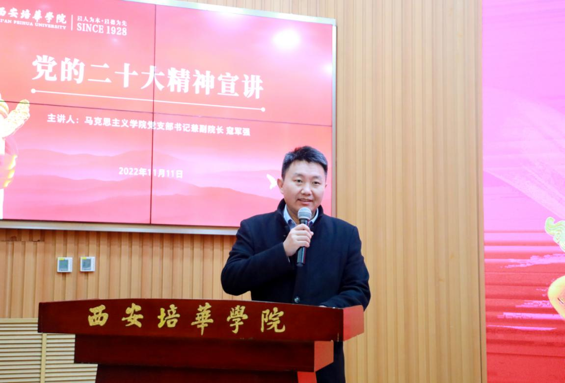 11月11日,西安培华学院马克思主义学院副院长寇军强为西安培华学院师生进行党的二十大精神宣讲。活动以线上线下的形式进行,各二级学院书记、副书记、教师代表、学生代表以及全体思政课教师在明德楼报告厅参加线下活动。