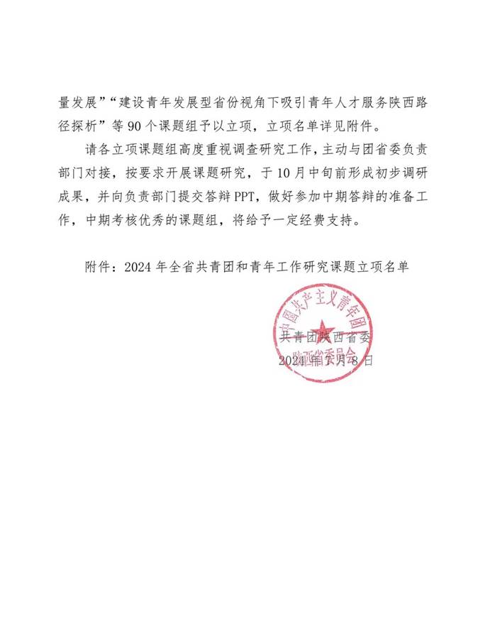 日前,共青团陕西省委发布《关于2024年全省共青团和青年工作研究课题立项的通知》(陕团发〔2024〕15号),我校2个项目获批立项。