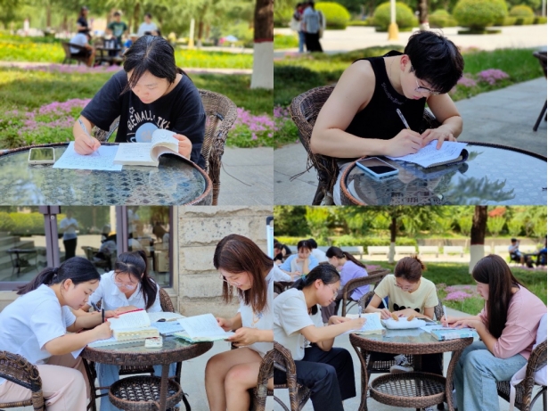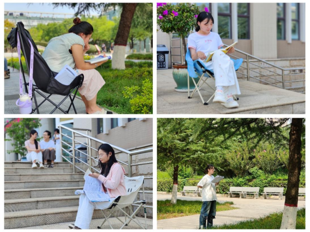 朗朗读书声,孜孜勤学影,清晨六、七点钟,图书馆外草坪上、道路旁、自修室,不少同学在专心致志地读书或背诵;这些如饥似渴的学生中,多为备战研究生、公务员、四六级、专业资格证书考试而来,也不乏阅读爱好者。