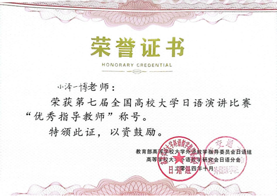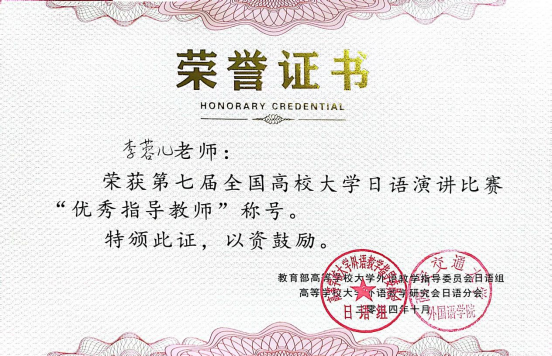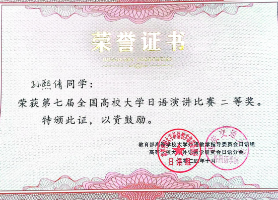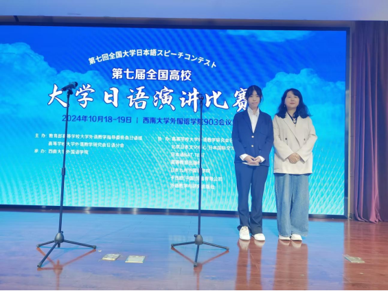 10月18-19日,由高等学校大学外语教学研究会日语分会、教育部高等学校大学外语教学指导委员会日语组主办的“第七届全国高校大学日语演讲比赛”在西南大学举行。此次是西安培华学院首次参加全国高校大学日语演讲比赛,学校传媒与设计学院学生孙熙倩凭借出色表现荣获比赛二等奖,学校指导教师李蓉儿、外籍教师小泽一博荣获比赛“优秀指导教师”称号。