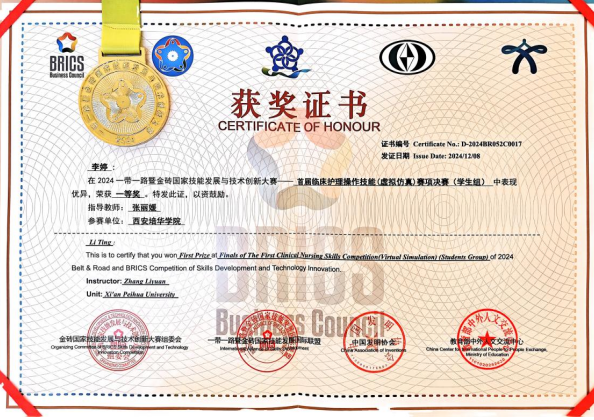 近日,2024“一带一路”暨金砖国家技能发展与技术创新大赛——首届临床护理操作技能(虚拟仿真)赛项决赛圆满落幕。培华学子在此次大赛中表现优异,经过激烈角逐,李婷同学荣获一等奖,医学院孙金玉同学荣获三等奖,李嘉欣、刘佳婧、安惠桃、王雨欣、王婷婷五位参赛选手荣获优秀奖。同时,张丽媛教师荣获“优秀指导教师”,西安培华学院荣获学生组“最佳组织奖”。这些荣誉的获得,不仅是对学生专业技能的肯定,更是对学校护理教育工作的认可和赞誉。