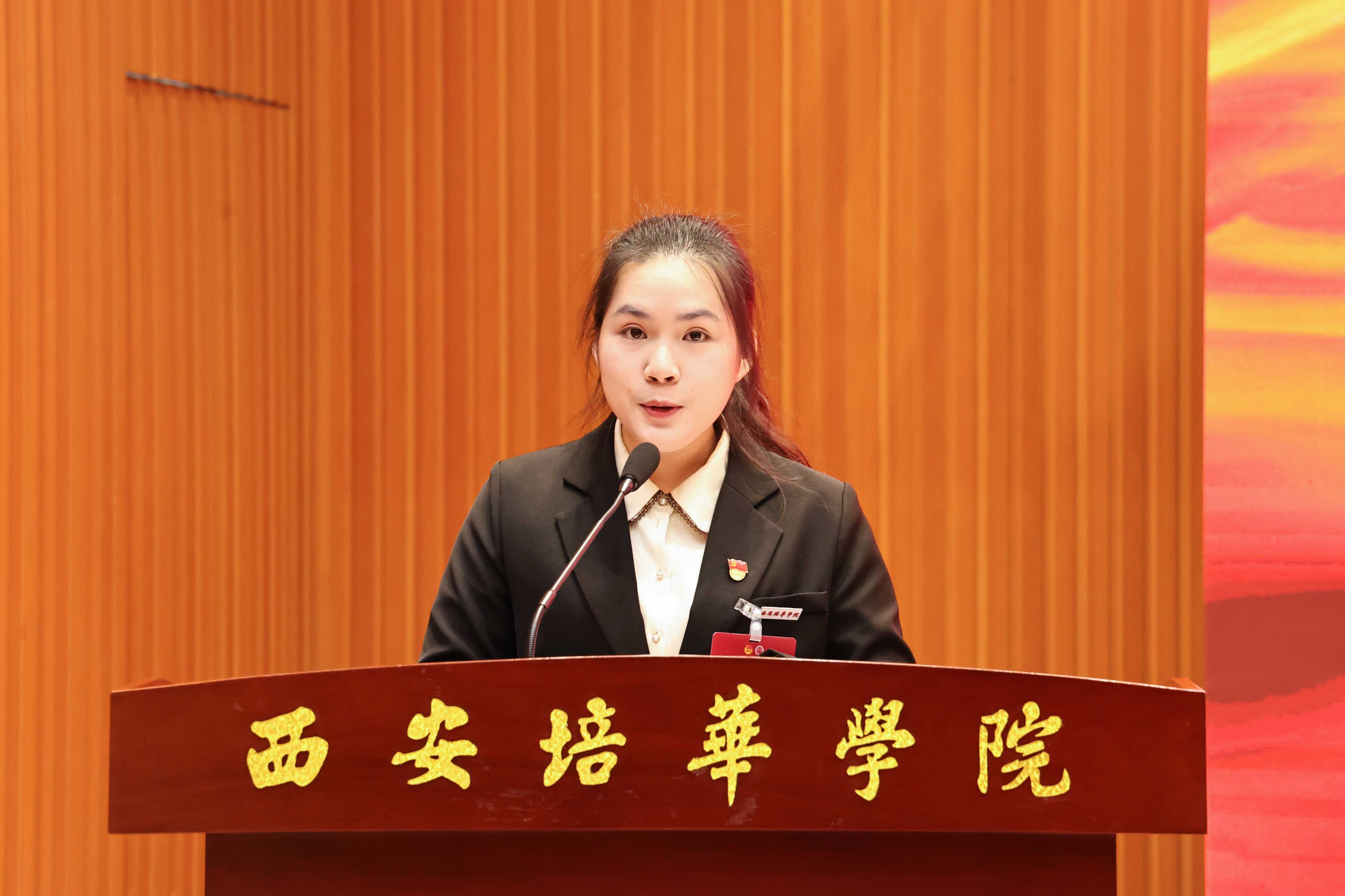 黄菁同学代表西安培华学院第五届学生会主席团作了题为《凝心聚力共奋进 笃行不怠启新征》的工作报告。报告汇报了近年来学生会的成绩和改革经验,同时从“坚守初心,凝心聚力”“笃行不怠,续写华章”两个方面对未来工作进行展望。她表示,学生会要学思践悟习近平总书记关于青年工作的重要思想,践行服务宗旨,深化改革创新,勇担时代使命,团结带领培华青年凝心聚力共奋进,笃行不怠启新征,引领凝聚广大青年为建设中国式现代化贡献青春力量、展现青春风采。