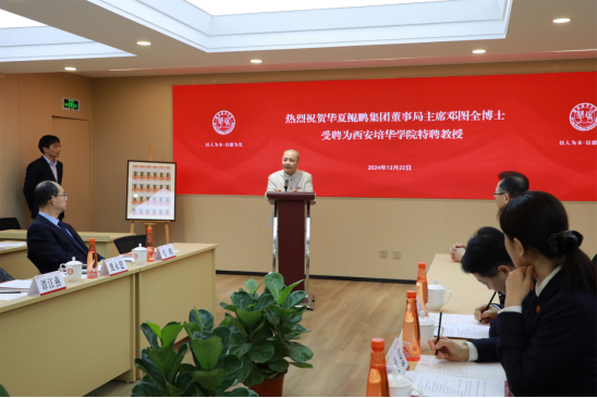 仪式上,西安培华学院理事长姜波博士向莅临本次活动的领导和嘉宾表示热烈的欢迎和衷心的感谢,并简要介绍了学校的发展历程、基本情况和办学特色。他讲到,学校历来重视产教融合协同育人,积极实施国际化战略。希望通过本次特聘教授的聘任以及与华夏鲲鹏集团等知名企业的合作,有更多的世界优秀华人代表和企业家走进学校,更多老师和学生能融入产业和行业,最终达到资源共享、合作共赢、高质量发展的局面。学校将携手签约企业,聚合更多业界精英,在女性教育、职业教育以及产教融合方面书写新篇章。