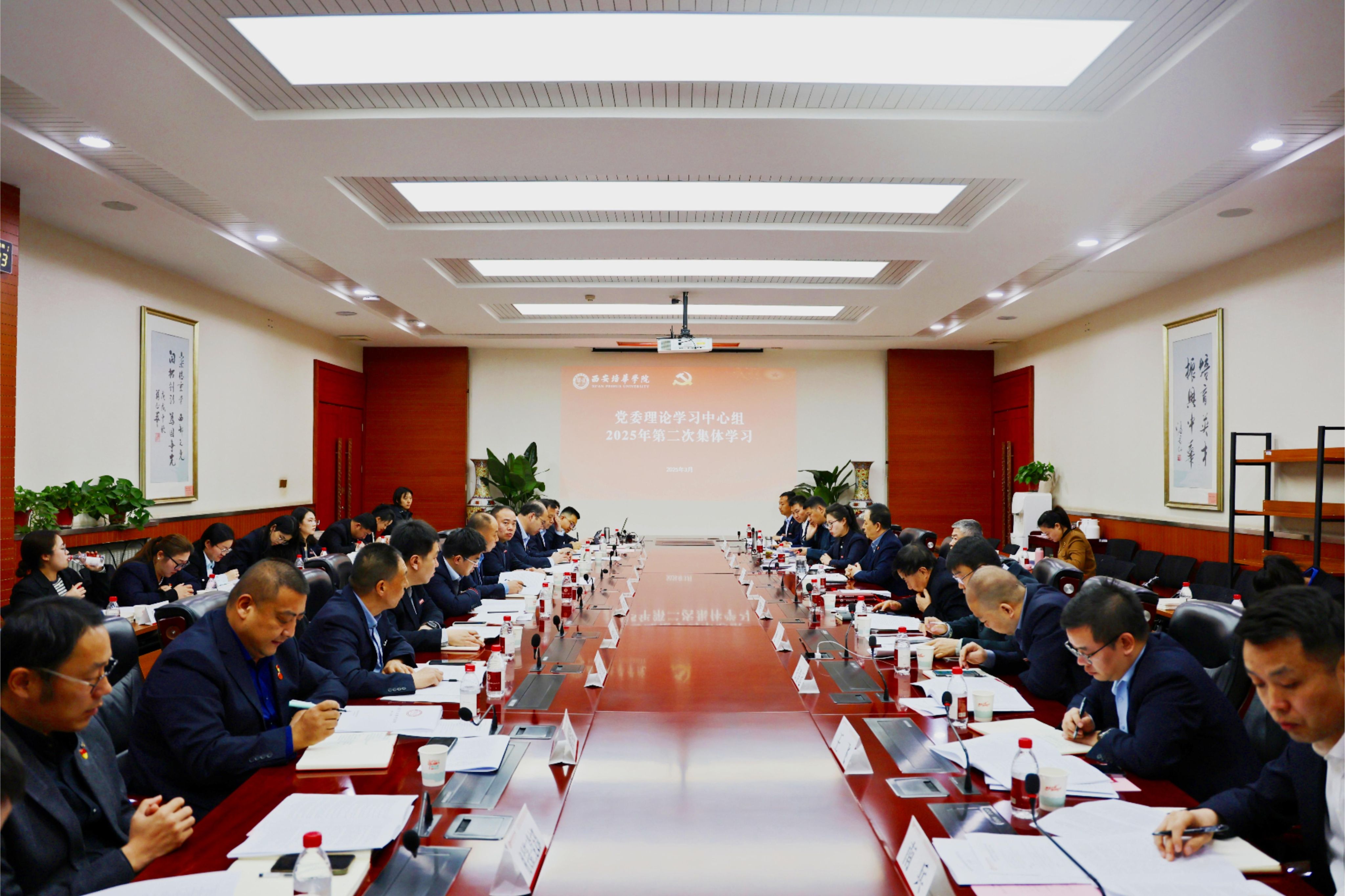 3月24日下午,西安培华学院党委理论学习中心组在明德楼第一会议室开展了2025年第二次集体学习活动。本次学习由校党委书记刘锋主持,校党委理论学习中心组成员、各学院党委(党总支)书记及副书记、直属党支部书记及副书记、党务干事等参加了会议。