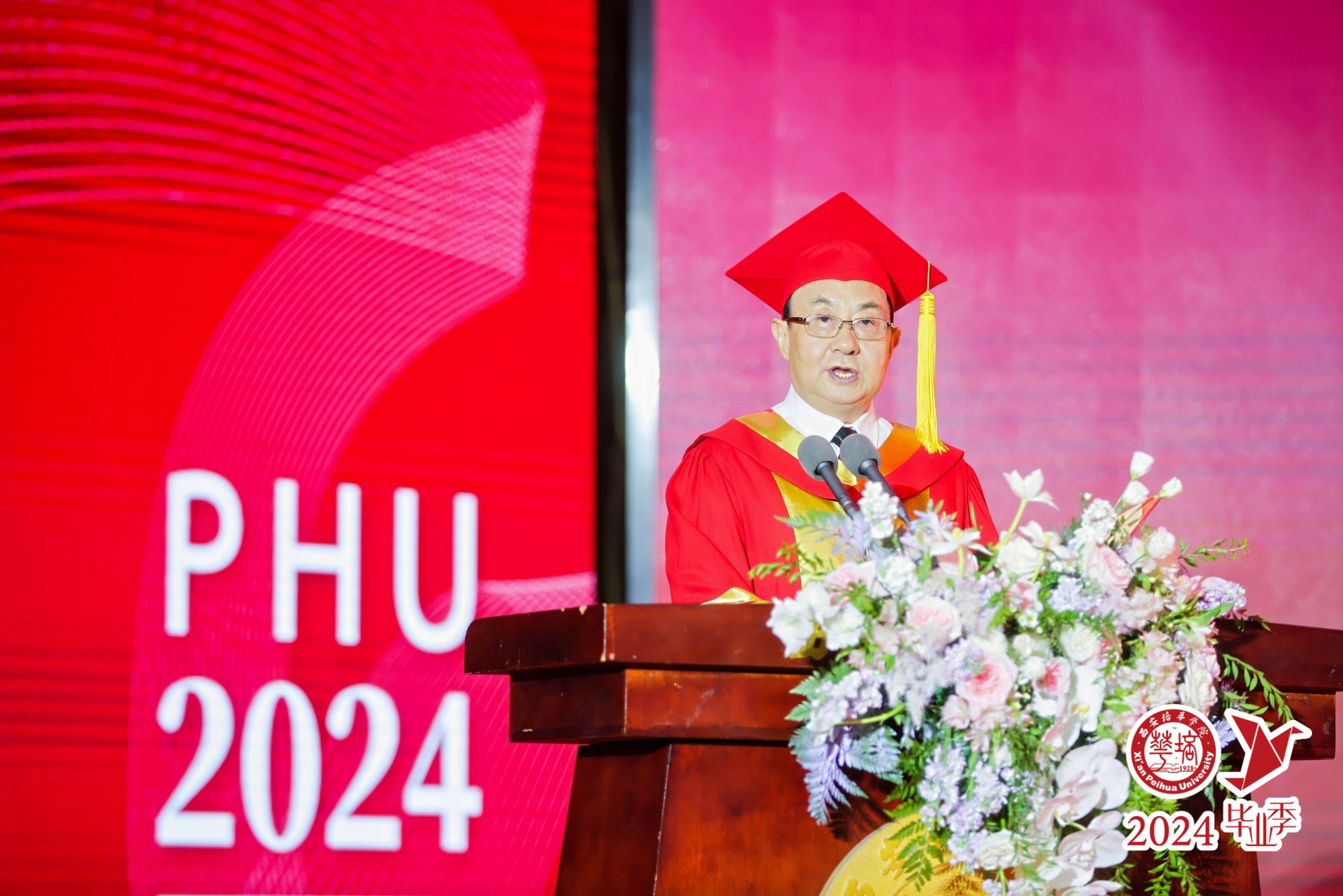 作为培华的大家长,姜波理事长语重心长地向毕业生告别。他回顾了学校自建校以来所经历的风雨历程,他表示在每个重要的历史节点上,培华人都拒绝“躺平”,做出了众多令人瞩目的成绩。他寄语全体毕业生们,要传承培华精神,卧薪尝胆,不畏艰难,用实际行动书写新的人生篇章;面对AI时代的到来,他叮嘱毕业生们要积极拥抱新技术,成为具备跨学科知识、技能的复合型人才;他还说到培华永远是校友们的避风港,无论未来走向何方,学校都会为每一位培华人的发展持续赋能、终身服务。