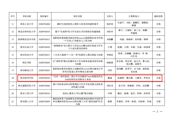 10月24日,中共陕西省委教育工委发布《关于公布2020年度学生工作精品项目和2021年度学生工作研究课题验收结果的通知》,经专家评审、现场答辩、工委研究,培华党委学工部副部长姚斌主持的2020年度陕西省学生工作精品项目《“五位一体共协同,四大平台同联动”——构筑具有民办高校特色的实践育人体系》验收合格,传媒学院党委副书记高嘉炜主持的2021年度陕西高校学生工作研究课题《新时代陕西民办高校辅导员培训体系构建研究》顺利结题。
