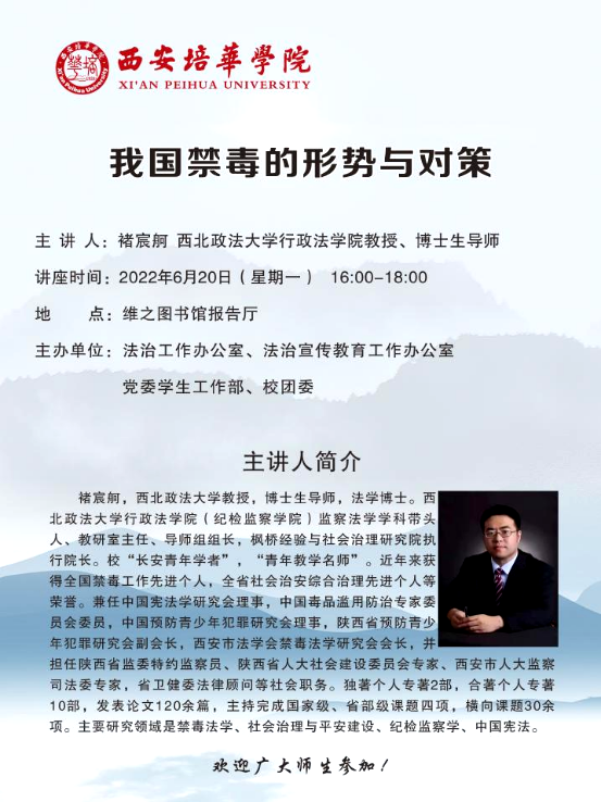 为进一步加强学校禁毒宣传教育工作力度,增强全体师生自我防护意识,提高广大师生识毒、防毒、拒毒和辨毒能力,促进校园和谐稳定发展。,6月20日下午16:00—17:30,西北政法大学博士生导师褚宸舸教授受邀在学校维之图书馆报告厅作题为“我国的禁毒形势与对策”的专题讲座。本次讲座由法治办公室、法治宣传办公室、党委学生工作部、校团委主办,线上+线下共计500余人参与,讲座由校团委书记杨媛主持。