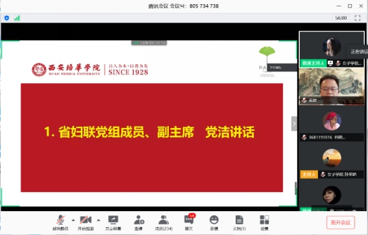 陕西省妇联副主任党洁对女子学院的老师们和同学们取得的进步表示祝贺。感谢西安培华学院的全体教职员工、全省各级妇联执委、巾帼志愿者、千万家庭及各团体会员与女性社会组织一起积极参与防控疫情的各项工作,进一步发挥妇联、妇儿工委办“两个平台”的作用。而对于今后合作发展的道路上,希望在相互搭建的平台上实现资源的对接,达到多方受益的效果。强调发挥高校基地的研究示范引领功能,为全省妇女的发展提供理论指引和实践指导。在男女平等关系上,扩大先进性别文化的覆盖面与影响力,继续重视发挥“男女平等基本国策”宣传培训基地的作用,普遍培养具有性别平等意识的大学生,勇于担当社会责任。在推动大学生创业就业上,予以鼓励,并进一步为支持女性创业就业工作进行平台搭建、提供菜单式培训,一站式服务,为女大学生就业创造条件。有效推动“陕西省女大学生创业就业培训基地”的工作。