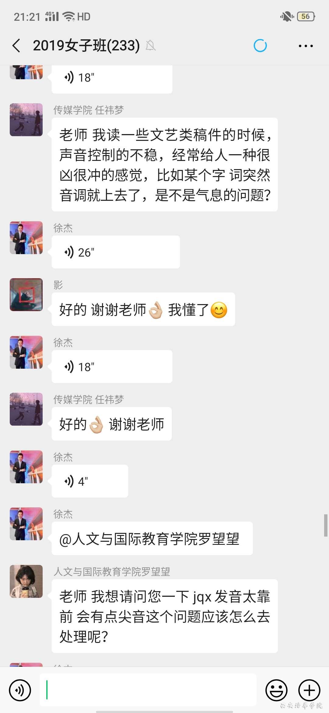 有播音与主持专业的同学向徐杰老师请教:“如何在上台演讲时,不会那么紧张。”徐杰老师向大家公布了自己的小诀窍:上台的时候呢,手里攥一个硬币或者纸巾,它会有很神奇的作用能让你保持镇定。当然还是要通过多上台锻炼,多成功几次,自身的信心也会建立起来。对朗诵的稿件要反复的揣摩和领悟作者表达的感情,并对它倾注自己的感情,才能在上台演讲时发挥出最好的水平。在回答完同学们的问题后,徐杰老师为同学们带来了近期的朗诵作品——以声抗“疫”《长安》,使同学们大饱耳福。徐杰老师勉励喜爱朗诵的同学们要坚持每天早上朗诵一首古诗词,不断揣摩古诗词中蕴涵的情感。