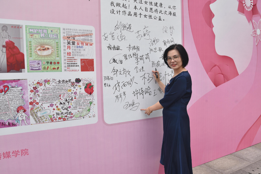 参赛代表们在自己的作品前发出倡议:“关爱女性健康,从你我做起!本人自愿将此次海报设计作品用于女性公益。”并在倡议书上签署姓名。通过参赛,选手们表达自己的创作初心,积极倡导为女性公益贡献自己的一份力量,展现当代大学生风采。