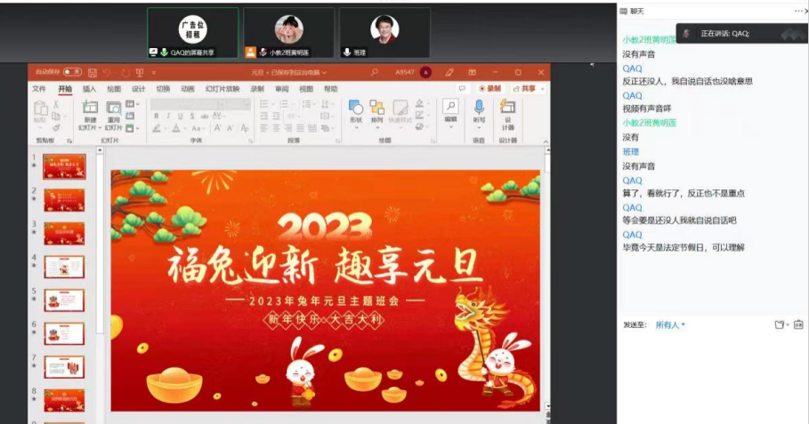 在2022年12月31日的时针转到10:00钟时,腾讯会议室中,又响起了志愿者和小朋友的读书声。当2023年的清晨在欢快的音乐中来到时,通过播放新年贺词,温暖了每一个志愿者们和皇甫村、王曲村小朋友的心。