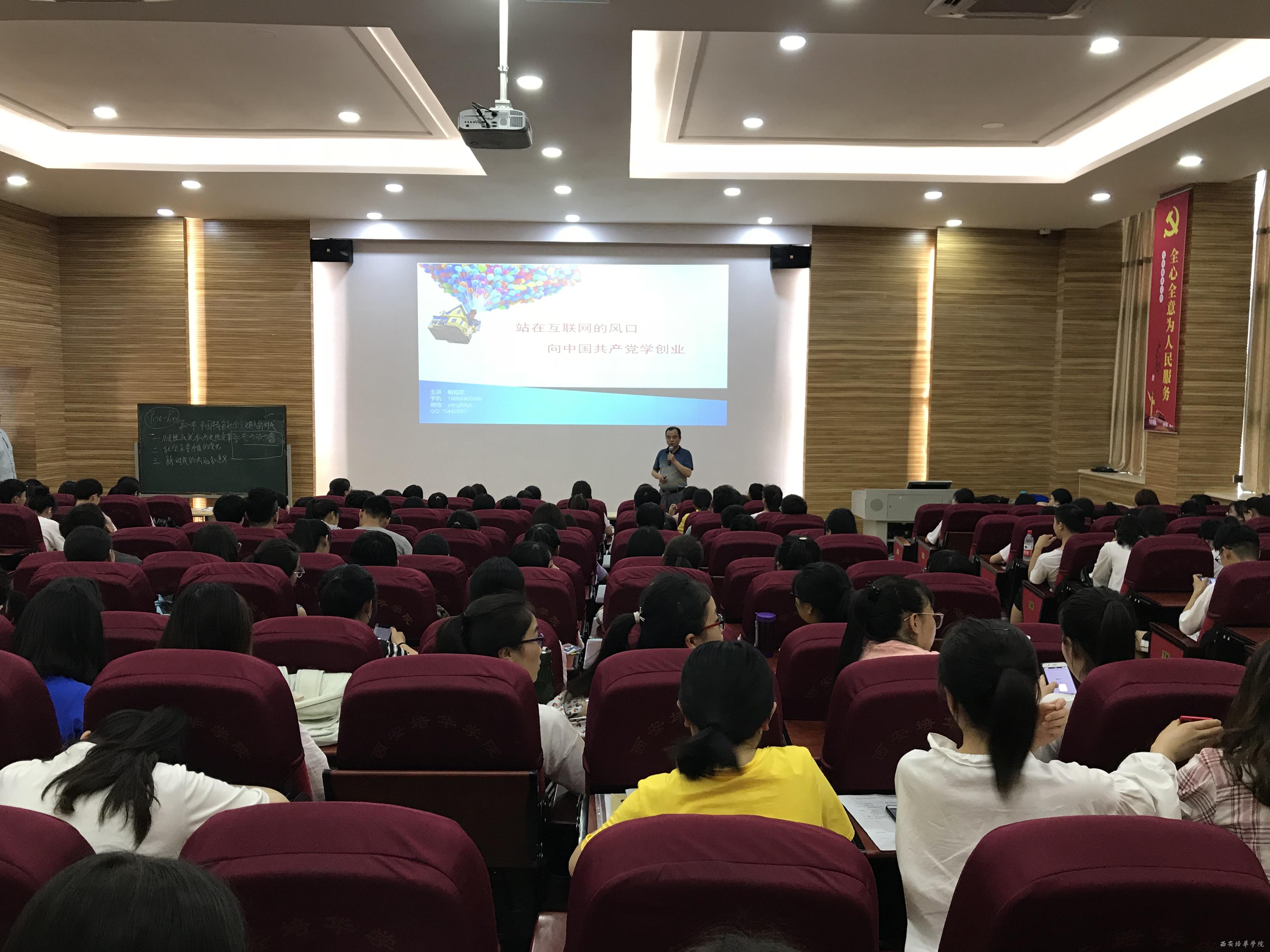此次讲座的主题是“站在互联网的风口向中国共产党学创业”。首先,主讲人杨柏欢副教授提出了“互联网是当代创业的风口”观点,带领学生着重分析了当前社会互联网行业的创业背景,并鼓励同学们以“互联网+”的形式来进行创业。其次,杨柏欢副教授分析了“互联网+”的市场经济的真正本质:民主 开放 平等,并以“中国共产党的创业经历”为模板,解决了同学们所关心的创业问题。最后,讲座在杨柏欢教授激情演唱的《我的未来不是梦》,鼓励同学们要立足当下,放眼未来,为自己的梦想而奋斗。