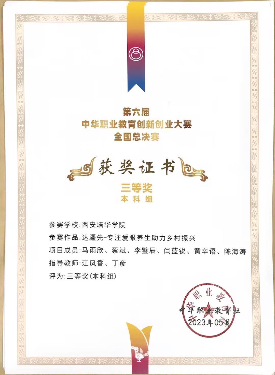 我校创业项目《达疆先-专注爱眼养生助力乡村振兴》经过省赛路演、国赛网评的激烈角逐,最终成功入选全国总决赛,荣获全国三等奖,突破我校在此项赛事的新纪录。