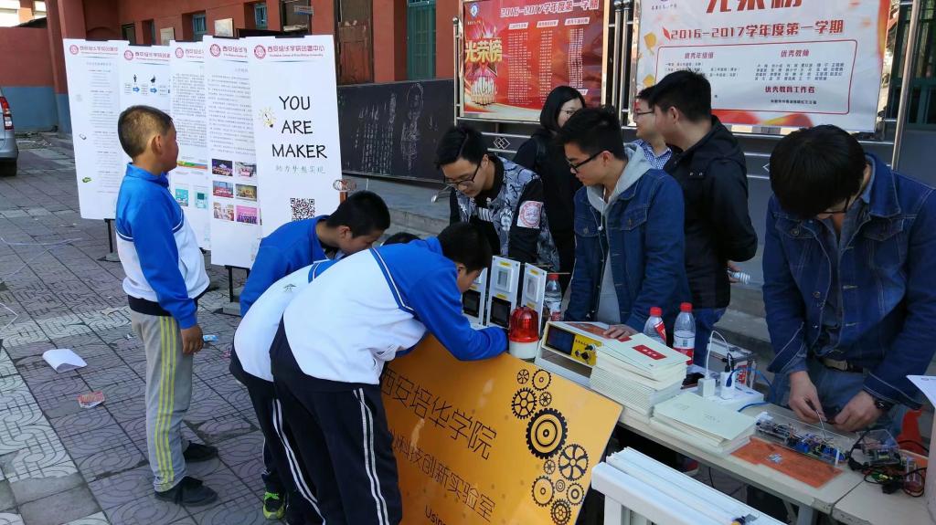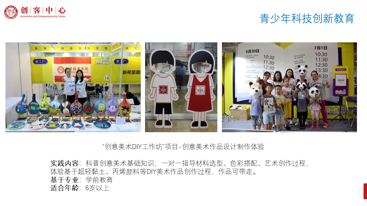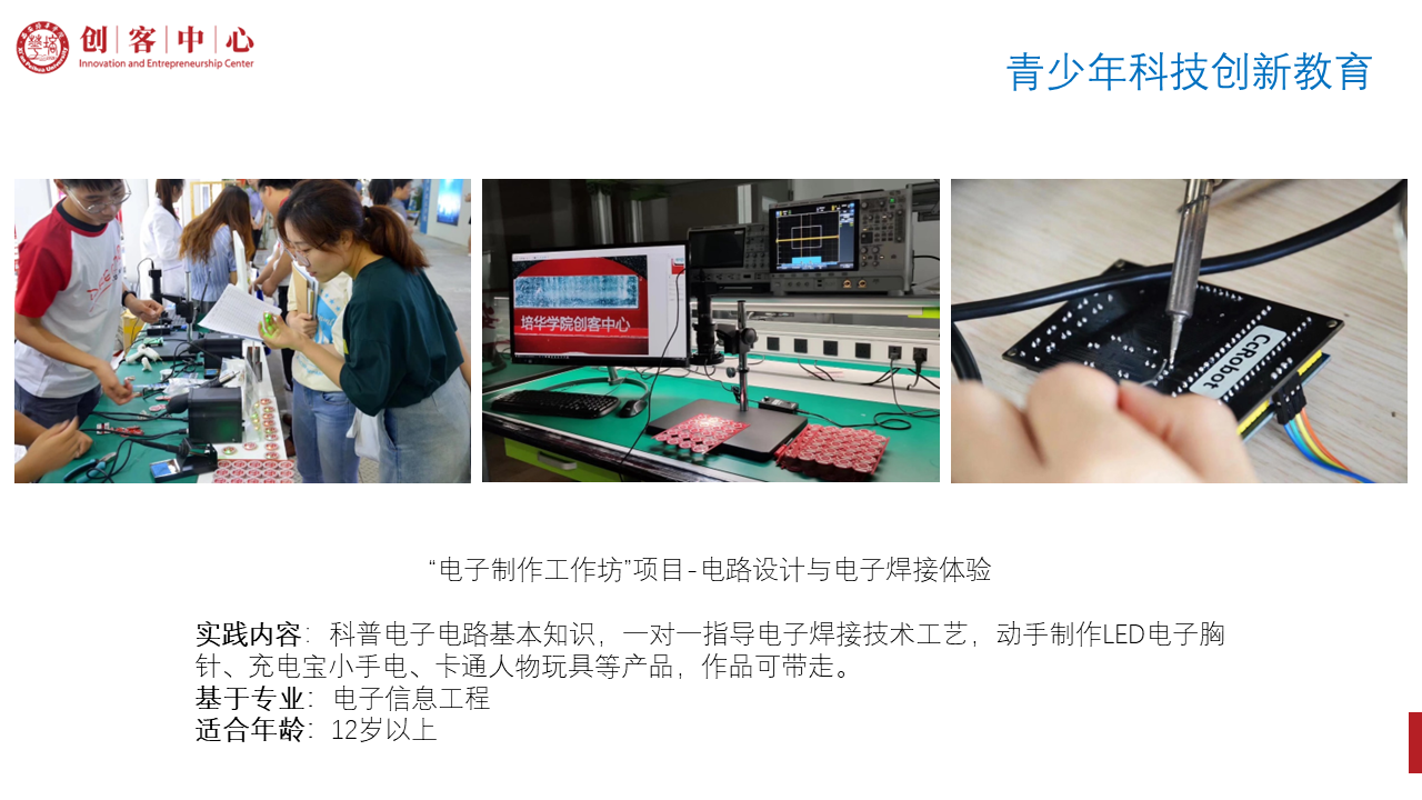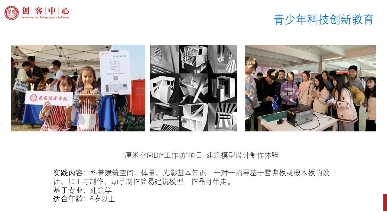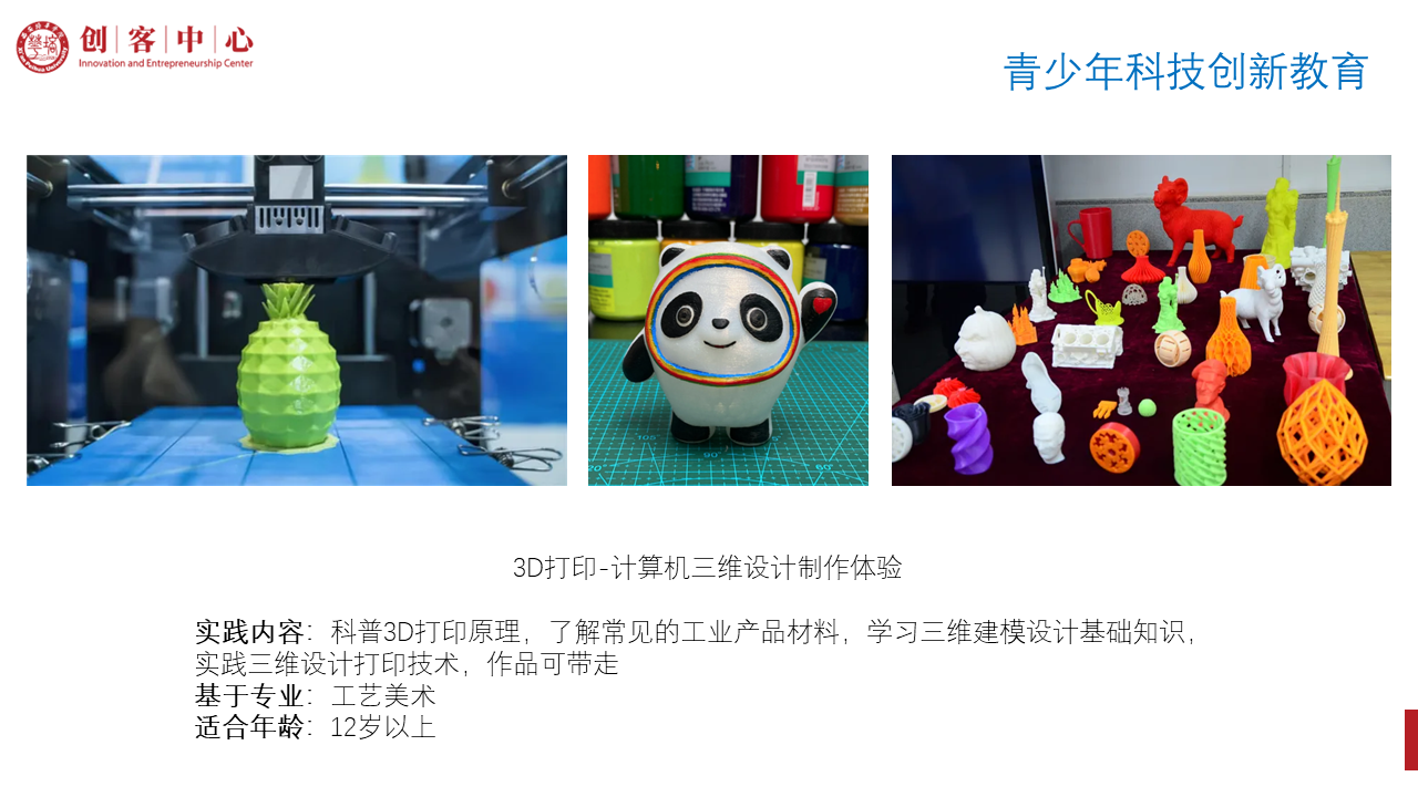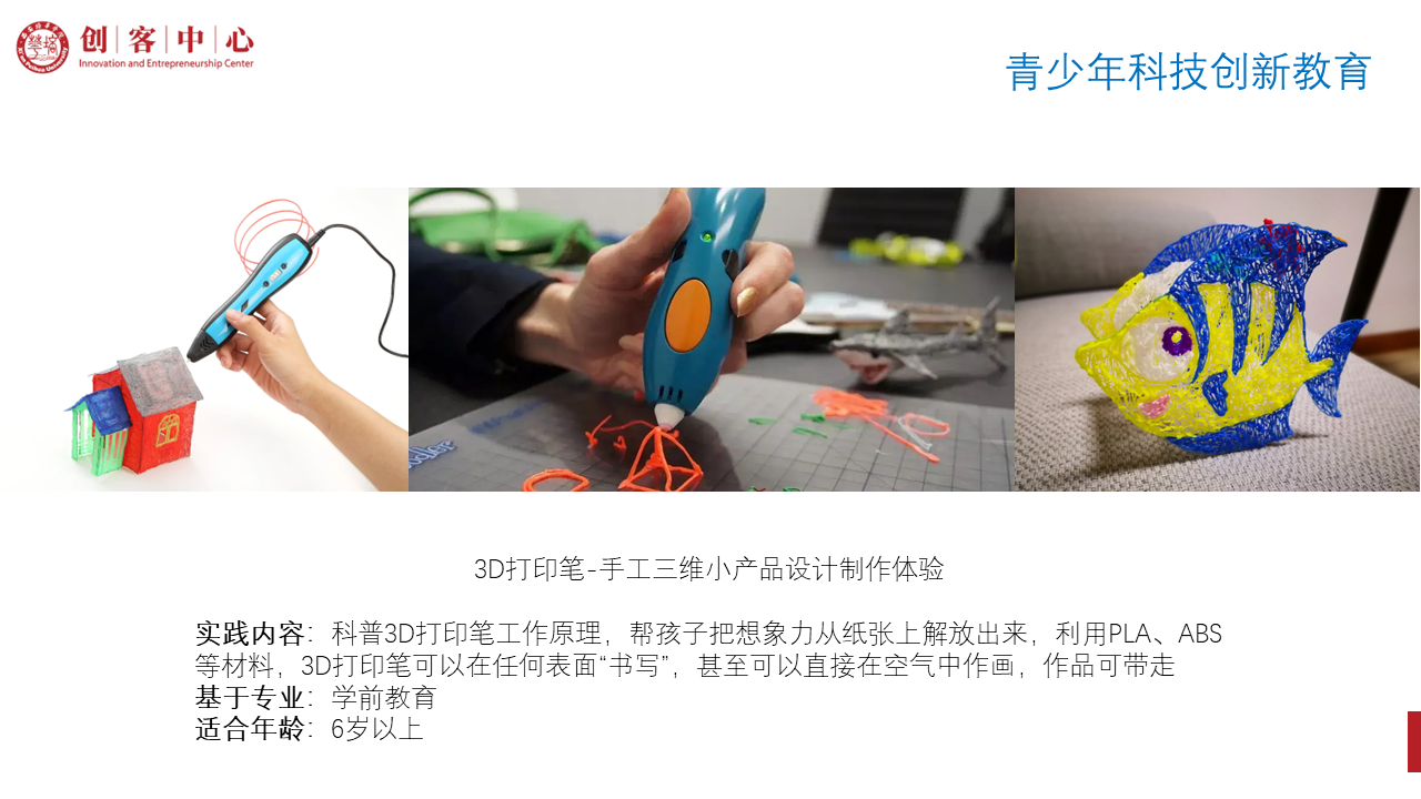 创客中心创客教育类课程活动,作为校企合作、产教融合项目的教学创新“试验田”,主要面向对科技创新、发明创造、动手实践、热爱创作等工作任务内容感兴趣的学生,通过创新思维训练、创客工具培训、创客项目课程、创客主题活动、社会实践体验、创新项目制作、主题演讲、创客马拉松竞赛、项目路演等9个方面对学员进行沉浸式、体验式授课。课程活动以项目成果为导向,以设计性、开放性任务目标和启发参与式课程为组织实施模式,着力推动学生有效行动,将专业再教育和创业能力训练紧密结合,将理论讲授和行动体验紧密捆绑,进一步增强创新创业教育的精准性和实践性,全面激发学生的创造力。