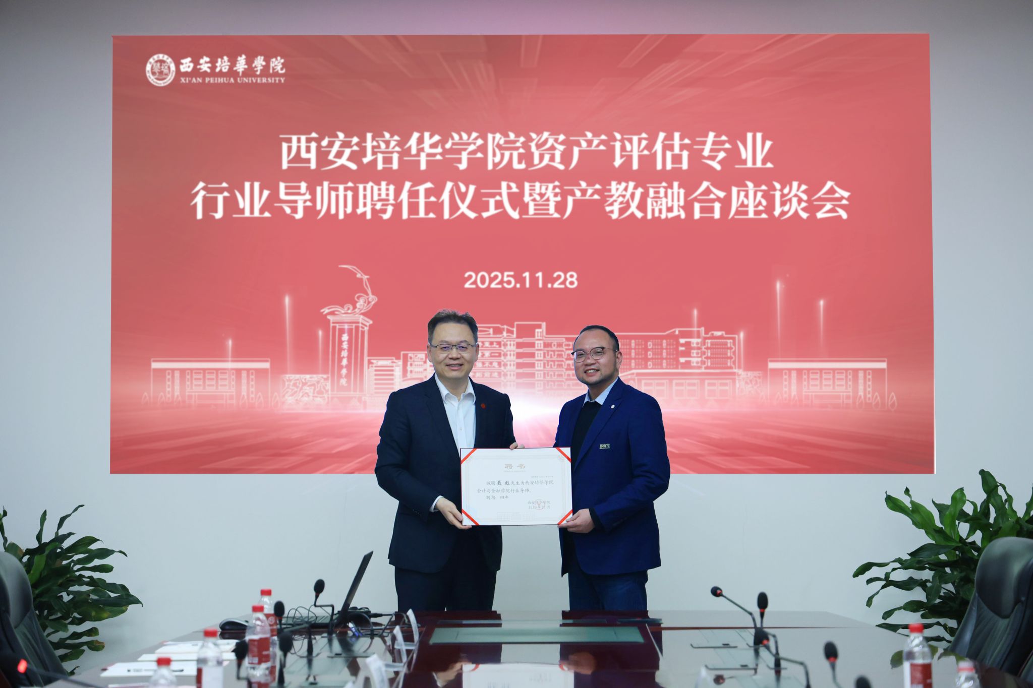 2025年11月28日,西安培华学院明德楼第一会议室,资产评估专业行业导师聘任仪式暨产教融合座谈会隆重召开。本次会议紧紧围绕“职业导向、能力牵引、项目驱动”育人路径,推进产教融合向纵深发展,通过深化产教协同、聚焦资产评估申硕目标、培育产业人才三大路径,贯通教育链、人才链与产业链三链衔接,推动资产评估专业高质量发展成功申硕。