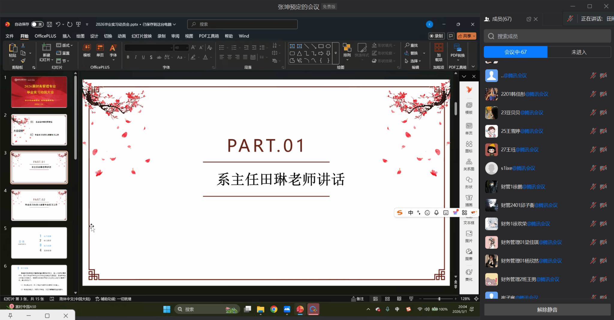 为扎实推进实践育人工作,帮助财务管理专业毕业生明确实习目标、规范实习流程、强化安全与纪律意识,2026年3月1日,会计与金融学院财务管理专业 2026 届毕业实习动员大会通过腾讯会议顺利召开。管理系主任田琳、实习负责人张坤,实习指导老师及 2026 届财务管理专业全体毕业生共同参会。