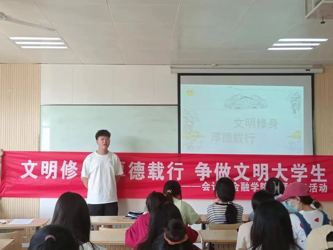 学风建设,是校风和校园文化建设的重要内容。为进一步丰富大学生的课余文化生活和活跃校园文化气氛,努力推进我校各班级各方面的建设和发展,聚力打造环境优雅、学风浓厚、班风向上、和谐稳定的班级文化。以此为契机,结合实际情况和具体特点,紧扣校园建设的核心灵魂,会计学2101班、会计学2102班、财务管理2101班、人力资源管理2101班等全院所有班级分别于2022年6月19日开展了“文明修身·厚德载行”主题团日活动,着力建设“优良学风”班集体为新的学年里新的共同奋斗目标。营造良好的校园文明氛围。