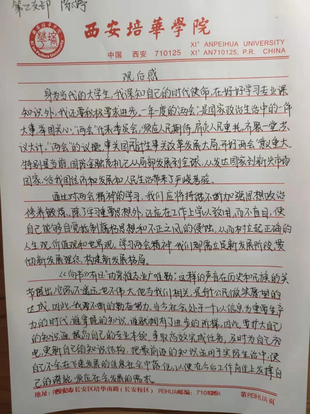 十年全国两会,十个春天的故事。这是思想之光照耀奋进之路。在2022年全国两会举行时,西安培华学院会计与金融学院秉承着伟大思想源自伟大时代,新的理论指导新的实践。以求学问道之心组织党委各支部进行两会观看学习与理解总结。疫情影响下,各个支部也于线上就两会内容进行学习与探讨。各支部同学提交反馈积极更显现出同学们“万山磅礴看主峰,沧海茫茫望灯塔”学习新思想,追随党和国家的爱国情谊。三月的中华大地春和景明,万物复苏。数千名全国人大代表、全国政协委员肩负人民重托和神圣使命齐聚北京,广谋良策、广聚共识、共商大计。在全面建设社会主义现代化国家新的道路上,今年全国两会必将谱写出民主、团结、求实、奋进的崭新篇章,激励亿万人民乘势而上,砥砺前行,向着第二个百年奋斗目标不断迈出坚实步伐。