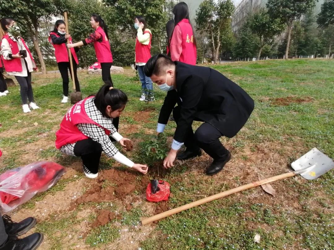 在阳光的照耀下,植树活动热烈展开。志愿者们与老师们分成几组,相继参与到植树工作中,或用铁锹铲土,或帮助固定小树。志愿者们在小树的周围覆起一个环形土堆,再在坑中浇上净水。随着最后一寸土壤被压实,在所有参与者的共同努力下,小树扎根草地,增添片片新绿,萌生点点春意。